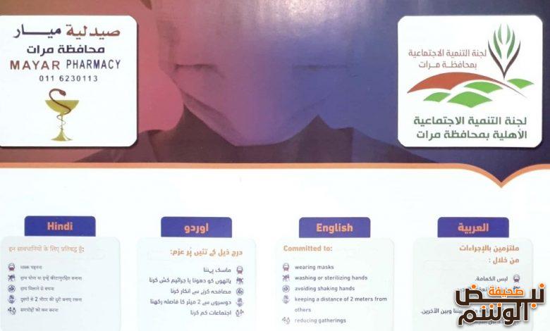 ضمن الجهود التي تقوم بها لجنة التنمية الإجتماعية بمحافظة مرات وبالتعاون مع صيدلية ميار ومن خلال برامجها التوعوية ضد فيروس كورونا والاجراءات الإحترازية فقد قامت اللجنة بتوعية العمالة من غير الناطقين باللغة العربية من مختلف الجنسيات من خلال الاشارة والتطبيق العملي للعمليات الاحترازية والإهتمام بالتباعد ولبس الكمامات والغسيل بالماء والصابون والنظافة العامة وعدم لمس الوجه والفم والانف والعينين وذلك من خلال توعيتهم وتكثيف التدريب على عمليات النظافة بالتوعية المستمرة مع الوصول اليهم في مقر سكنهم وأماكن تجمعاتهم.
