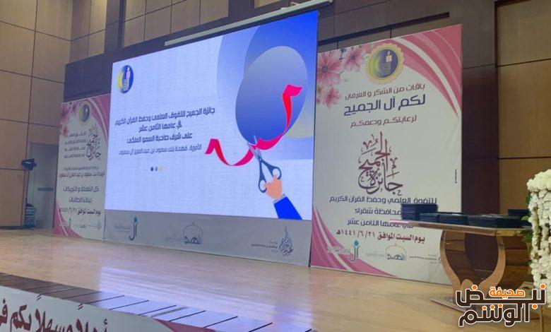 برعاية كريمة من صاحبة السمو الملكي الأميرة فهدة بنت سعود بن عبدالعزيز آل سعود يُختتم حفل جائزة الجميح للتفوق العلمي وحفظ القرآن الكريم للطالبات في عامها الثامن عشر، وذلك بعد ظهر اليوم السبت في مركز التنمية الاجتماعية بمحافظة شقراء ، وتم تسليم الجوائز للطالبات المتفوقات .