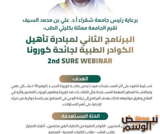 برعاية رئيس الجامعة الأستاذ الدكتور علي بن محمد السيف، تقيم جامعة شقراء، ممثلة بكلية الطب بشقراء وكلية الطب بالدوادمي “البرنامج الثاني لمبادرة تأهيل الكوادر الطبية لجائحة كورونا” 2nd SURE WEBINAR، وذلك على مدى يومين خلال الفترة من 12 -13 مارس 2021م، وبمشاركة 12 من المختصين في المجال الطبي، بهدف تسليط الضوء على آخر المستجدات فيما يخص جائحة كورونا بشكل علمي.